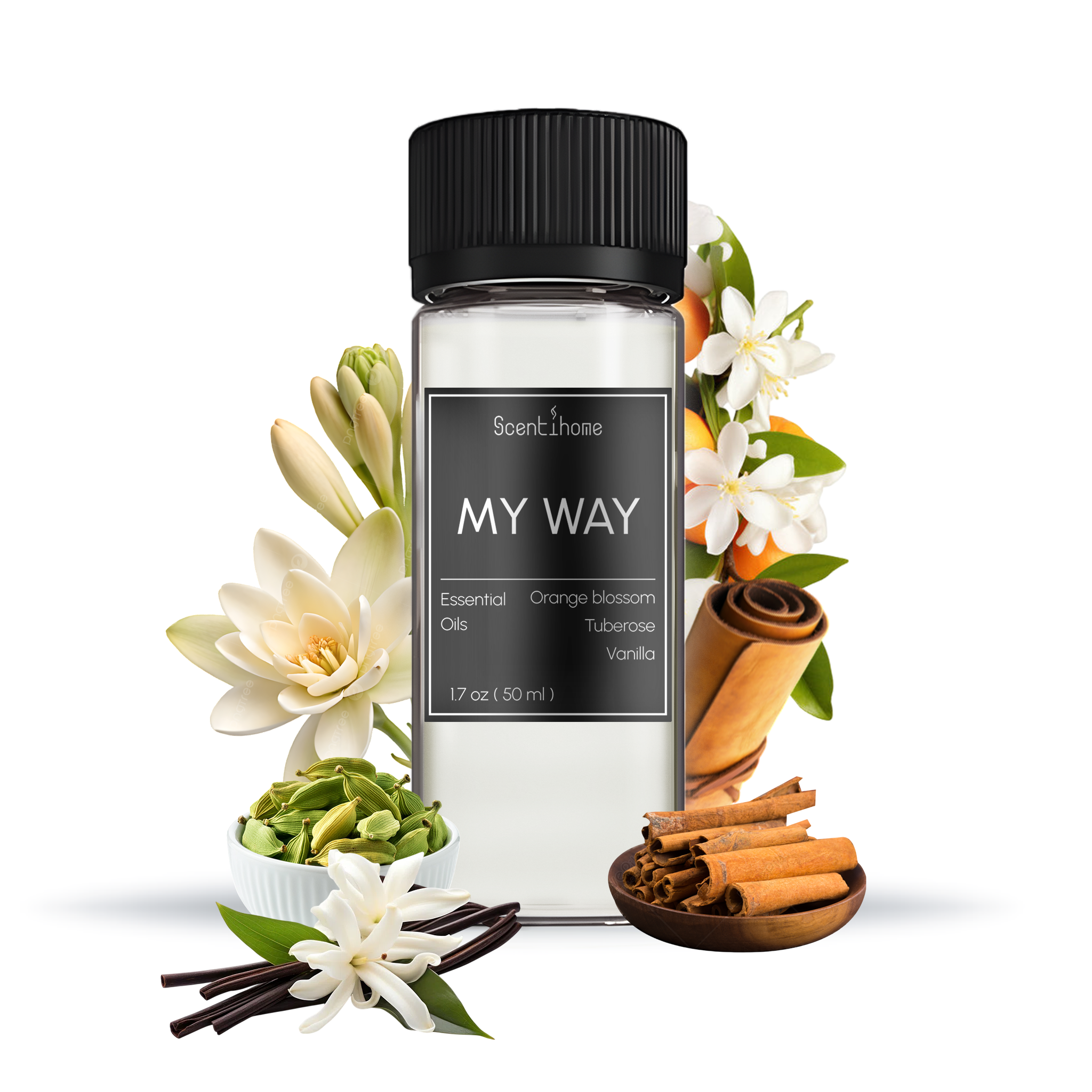 • My Way completes the experience with graceful notes of orange blossom, tuberose, and white musk — a refined whisper of confidence and charm.